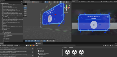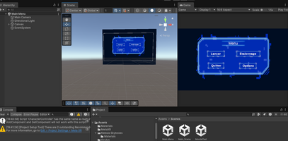 Après avoir créé les menus, nous les avons intégrés dans Unity. Nous y avons ajouté les fonctionnalités basiques telles que Lancer, Quitter et Revenir en arrière, ainsi que des effets de survol.